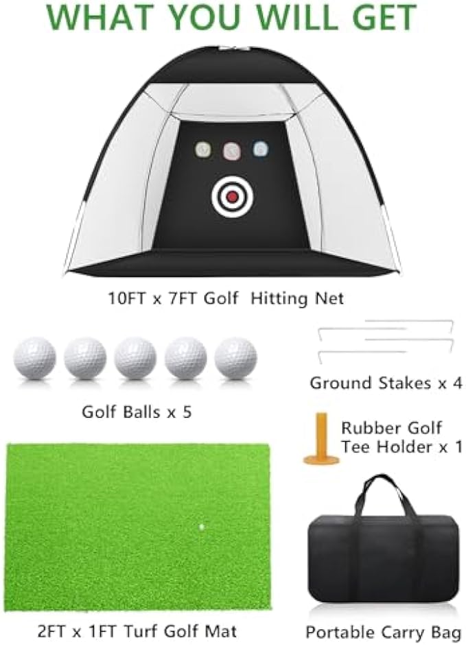 【What You Will Get】 Our golf training net comes with 10 x 7 x 6 ft (W*H*D)Golf Hitting Net,1 x golf tee,5 x golf balls, 1 x golf hitting mat, and 1 x carry bag. Home sports game golf swing training nets with targets All-in-One, Ideal golf training aid for men/boys, golf beginners, and golf lovers.
