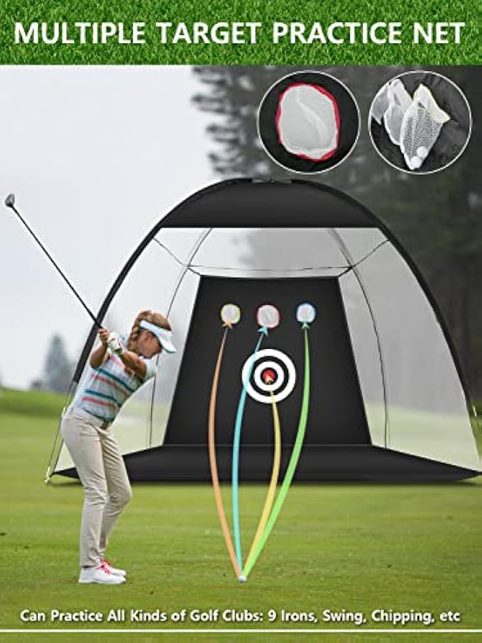 • 【What You Will Get】 Our golf training net comes with 10 x 7 x 6 ft (W*H*D)Golf Hitting Net,1 x golf tee,5 x golf balls, 1 x golf hitting mat, and 1 x carry bag. Home sports game golf swing training nets with targets All-in-One, Ideal golf training aid for men/boys, golf beginners, and golf lovers.