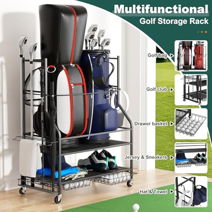• [STURDY RACK & LOCKABLE WHEELS]: This golf bag stand is sturdy and reliable. Premium Coating of the golf organizer avoids peeling or rusting and the high-quality steel keeps whole golf storage organizer from bending or cracking. The golf bag storage rack is equipped with 4 wheels, and two of them are lockable, so you can be sure it will stay still and stable in any occasions.