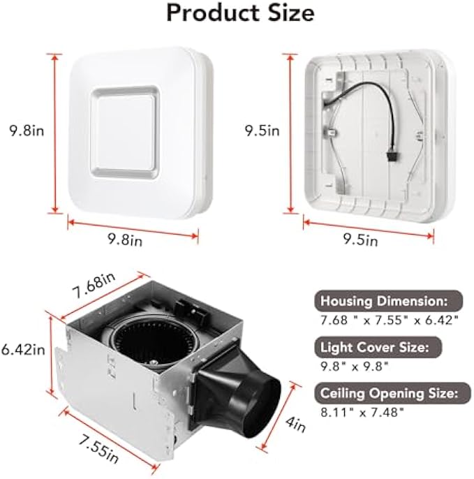 • 【Easy to Install】OREiN bath fan fits 8.11" x 7.48" ceiling construction and comes with fast bracket for secure and easy installation. Housing Dimensions 7.68" x 7.55" x 6.42". Light cover size is 10.1'' x 10.1". Just mount the bathroom vent fan between ceiling joists with fast bracket, or nail/ screw it directly to the joist.