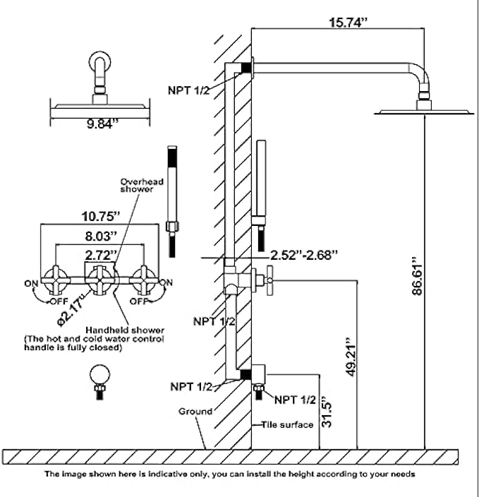 • Gold Shower Faucet Set Package List: 1*10 inch round gold rain shower head (304 stainless steel), 1*extra long 15.74 inches shower arm (solid brass, Flange Included), 1* handheld sprayer(solid brass), 1* 59inches shower hose(304 stainless steel), 1*shower mixer rough-in valve(solid brass) and handle trim kit(Zinc Alloy), 1*necessary screws tool kit.