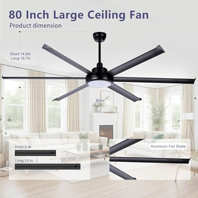 • 【80 Inch Ceiling Fan with Light】KINDLOV modern ceiling fan has a simple and unique design with 6 matte black fan blades, strong airflow, 6 speeds,You can choose between comfort air, natural air and powerful air.The large ceiling fan with light and remote control can be used in the home or business, for rooms such as spacious living room, farmhouse, office, garage, warehouse, factory or outdoor covered space.