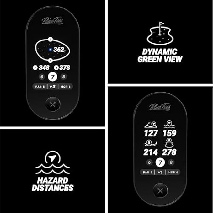 • FEATURE PACKED DEVICE - Blue Tees Ringer user-friendly touch screen simplifies navigation. Get precise yardages with built-in GPS, ensuring accurate shots. The device's auto-course recognition instantly loads course data, while advanced scoring and dynamic green view provide a detailed analysis of each hole is. Hazard distances keep your strategy sharp, and shot tracking records every swing for improvement.