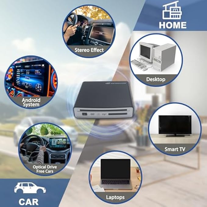 • Compatible with Multiple Vehicle Models and Devices:This upgraded CD Player is compatible with all car stereo systems that support playing music files in WAV format. In addition to car CD use, it can also be used as a DVD Player compatible with computers, televisions, projectors and more.