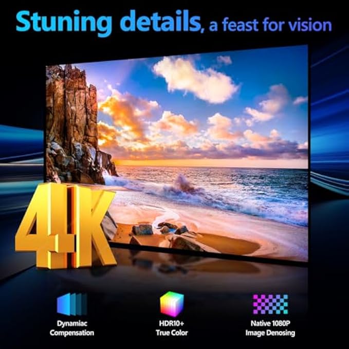 • 【1200 ANSI & 4K Decoding, High Brightness & Clarity】The smart projector leads the way in visual experience, boasting a 1200 ANSI lumens and 4K decoding, giving you a bright & vibrant image with impeccable detail even during the day. Combined with the latest HDR10+ and MEMC tech, it delivers astonishing clarity, contrast, and color accuracy. Our 4k projector is the ultimate cost-effective choice for home and outdoor projection, bring you a true visual feast.