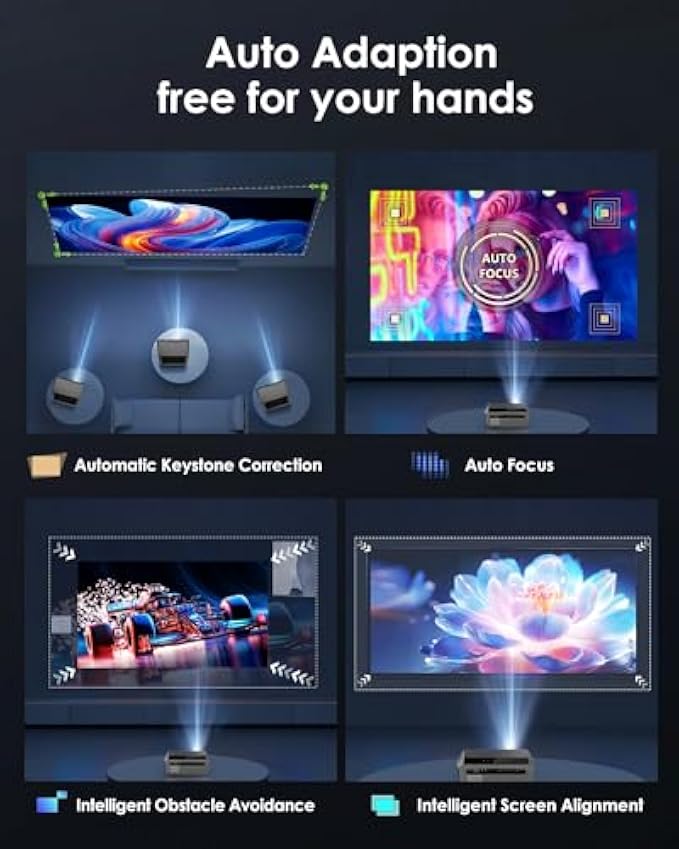 • 【Simpler & Easier-Auto Focus & Keystone】Instead of fussy and repetitive manual adjustments,our home theater projector built in displacement sensor to detect the movement of the projector and automatically adjust the image focus and distortion,ensuring you a perfect clear rectangular picture and sharp visuals in 5 seconds. Besides,the 4D keystone&quick H/V keystone correction,50% image zoom,allow you to enjoy more hassle-free screen adjustment. Convenient for ceiling,front,rear projection.