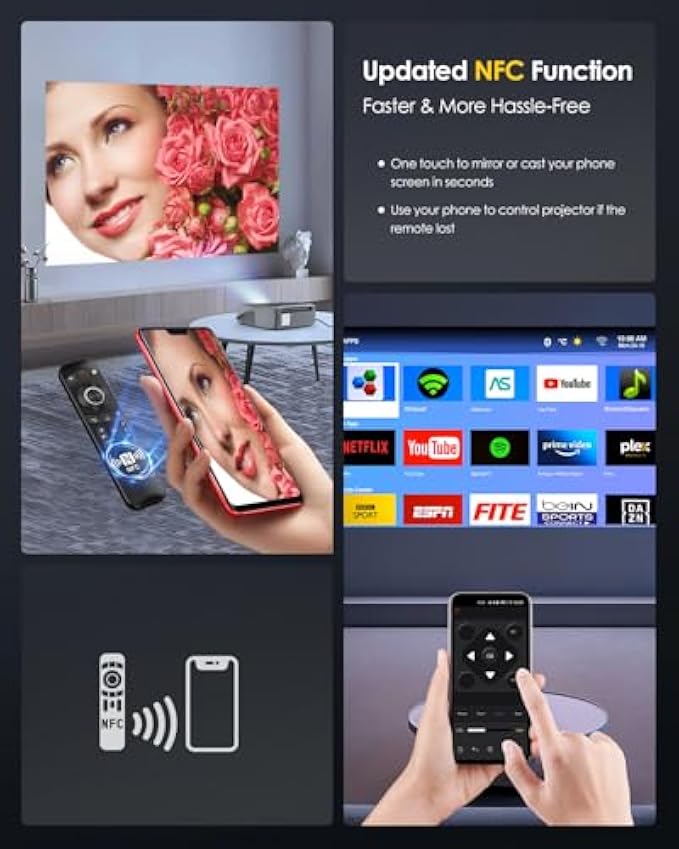 【Brighter & Sharper-1200ANSI 4K Projector】 CAIWEI ultra HD projector adopts 5.7” LCD screen & 7 layers high transmittance lens to offer higher clarity,delicacy,brightness.Full HD projector delivers crystal-clear image with native 1920*1080 and 4K decoding,ensuring every detail is vibrant and sharp.1200ANSI high lumens,16000:1 contrast,Intergrated with DCI P3 wide color gamut and HDR 10+ processing tech,giving you the best viewing experience with lifelike colors even in daytime or lights on. 【Simpler & Easier-Auto Focus & Keystone】Instead of fussy and repetitive manual adjustments,our home theater projector built in displacement sensor to detect the movement of the projector and automatically adjust the image focus and distortion,ensuring you a perfect clear rectangular picture and sharp visuals in 5 seconds. Besides,the 4D keystone&quick H/V keystone correction,50% image zoom,allow you to enjoy more hassle-free screen adjustment. Convenient for ceiling,front,rear projection. 【Faster & More Convenient -- New NFC Feature】A brand new feature- NFC is added to this home movie projector. Just need a single touch of your NFC enabled cell phone on the remote control, your phone screen will be projected on the big screen instantly. More hassle free than normal screen mirroring. No need to worry about remote lost,your phone can be transformed into a remote control for more sensitive and convenient operation of the projector. 【Smarter & Smoother - Android OS & WIFI6】Experience the seamless no lag online streaming via its Android 9.0 TV OS with 8000+ authorized Apps.Giving you access to over 500,000+ movies and TV episodes from Prime Video,YouTube,Disney+,Netflix,and more.Smart projector allow you to achieve smoother and more stable online surfing thanks to its dual 2.4G/5G WIFI and ultra fast WIFI6 connectivity. Enjoy no lag watching than ever before. 【Bigger & Louder- 300” Display & HIFI Speaker & Bluetooth5.2】Immerse yourself and the audience in rich,high-quality sound with the built-in 38W HiFi speakers,projector even can be a standalone Bluetooth speaker by its bidirectional Bluetooth feature.Latest Bluetooth 5.2 enable stable connection to Bluetooth speakers,earphone,mouse etc. Combined with up to 300" ultra large display,outstanding visual and audio effect enable you to enjoy cinema like viewing experience for movie,games,sports. 【Quieter & Longer - Fully Sealed Engine】Self-designed DMS optical engine with HEPA air filtration system,effectively block dust from entering.Hydraulic fast-flow cooling system keeps the temperature stable and continuously outputs high-quality image,extend the LED lamp life to 100,000 hours as well as reduce the fan noise to provide more comfortable viewing experience. Removable footpads to fit M4 size ceiling mount.CE/FCC certified;2-year warranty;Lifetime Support.