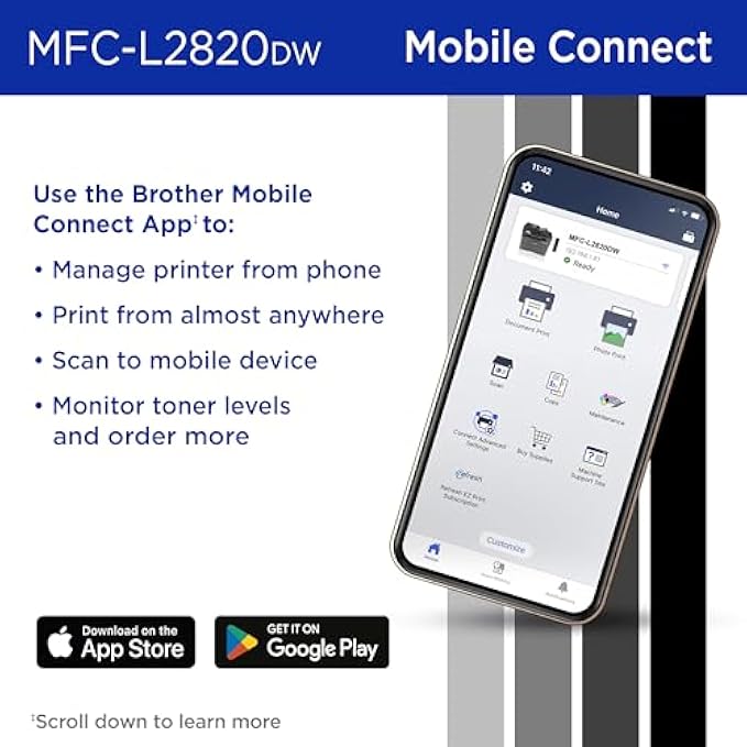 • BROTHER MOBILE CONNECT APP – Print, scan, and manage your wireless printer anytime, from almost anywhere from your mobile device. Order Brother Genuine Supplies, track toner usage, and complete more work on-the-go(6)