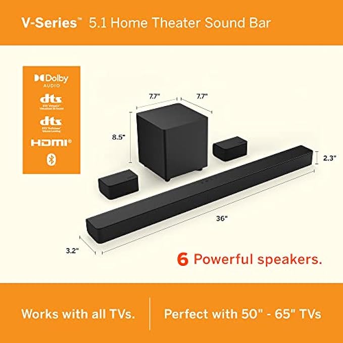 VIZIO V-Series 5.1 Home Theater Sound Bar with Dolby Audio, Bluetooth, Wireless Subwoofer, Voice Assistant Compatible, Includes Remote Control - V51x-J6