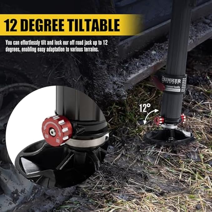 • Adjustable Lifting Hook: Bunker Indust hydraulic farm jack features ten hooking points that empower you to adjust the hook's height, ensuring the perfect lift initiation. Effortlessly accommodate inclines by tilting and locking our hydraulic recovery jack up to 12 degrees, providing easy adaptability to inclines. This level of versatility of our hydraulic recovery jack ensures secure lifting in any situation.