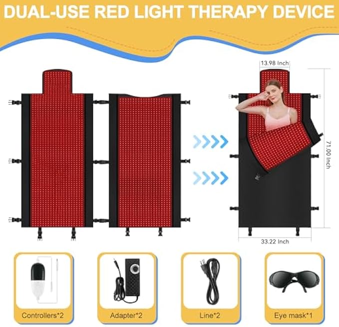 • Whole Body Red Light Therapy for Home Use: The Whole Body Red Light Therapy Mat stands out for its innovative spectrum, which contains 3100 light beads that emit dual wavelengths (660 nm and 850 nm). This unique blend ensures that whole-body red light therapy is comprehensive and guarantees precise solutions to a wide range of health problems.