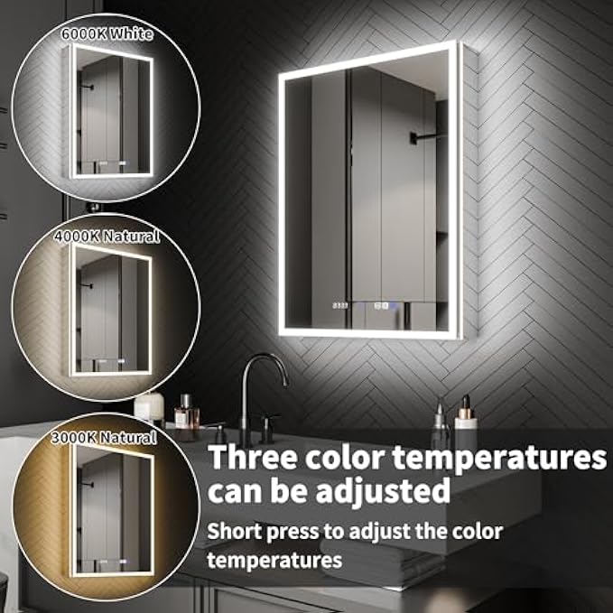 • 【Seamless Brightness and Interior LED】Our lighted medicine cabinet offers a seamlessly adjustable brightness range from 10% to 100%, enabling you to customize the lighting to your exact preferences. With a versatile color temperature adjustment from 3000K to 6400K, you can effortlessly dial in the perfect ambiance, whether you're applying makeup or seeking a relaxing atmosphere. Additionally, the cabinet's interior LED lighting ensures you can easily locate your items, providing a well-lit space for efficient organization and quick access.