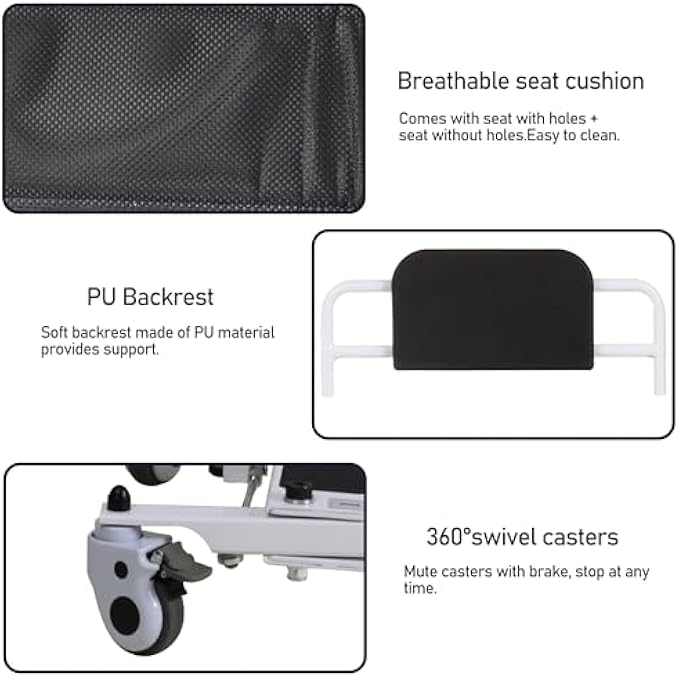 • 【Enhanced Seat Design】: With its anti-slip metal hook design, the patient lift chair prevents users from sliding off the seat, thereby avoiding secondary injuries. It is equipped with two seat options - one with a hole for convenient toileting and one without.