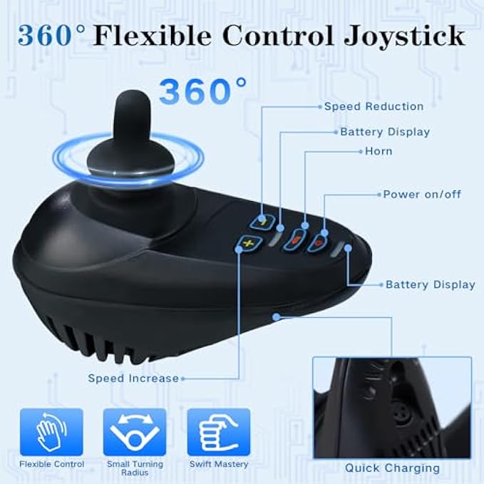 • Powerful Motors & Easy to Operate: Equipped with 2*250W motors, this wheelchair delivers powerful performance, enhancing its outstanding off-road capability. The responsive 360-degree joystick allows for easy maneuvering and braking even in tight spaces