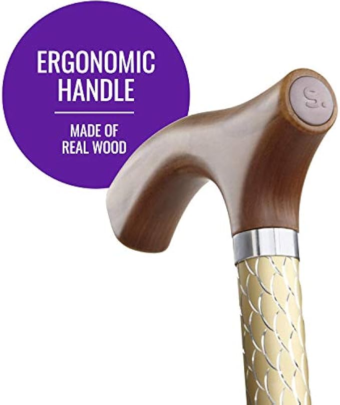 • ERGONOMIC HANDLE ON THIS WALKING STICK is made of real wood that has been painted, polished and contoured to help reduce hand cramping or muscle fatigue providing a comfortable grip. The durable wrist strap gently fits around the wrist to help prevent slipping or dropping.