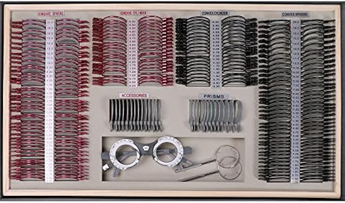 • Easily-Distinguished lenses - Including 266pcs lenses and 2 cross cylinders in the case, with 160 pcs of spherical lenses (red concave lenses and black convex lenses), 80 pcs of cylindrical lenses (red concave lenses and black convex lenses), 12 pcs of prismatic lens, 14 pcs of accessories and 2 cross cylinders. Each lens handle is engraved with markings, and the lens power is printed on the tray.