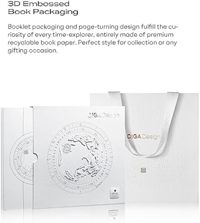 • Booklet packaging and page-turning design fulfill the curiosity of every time-explorer, entirely made of recycled premium book paper. The meticulously stamped pattern adorning the package cover gracefully echoes the intricate details found on the silvered dial.
