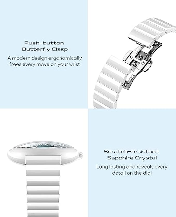 • Perfect style for collection or any gifting occasion. Characterize a sporty yet stylish silicone strap, and a smooth skin-friendly ceramic strap with a push-button butterfly clasp. Naturally complements the dial and can be dressed up or down.