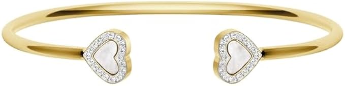 Bulova-Ladies' Crystal Gold-Tone Stainless Steel Box Set,White MOP Dial 3-Hand Quartz-Watch, MOP Heart Crystal Accent Bangle and Gold-Tone Bolo Chain Crystal MOP Hearts Bracelet, 30mm Style:98X137